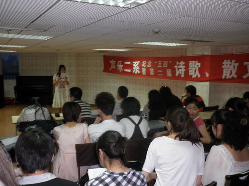 2009年5月18日晚,声乐二系第二届诗歌、散文朗诵比赛在琴房大楼十楼大教室举行,系相关领导及老师参加了此次的活动。 此次朗诵活动的主题都是以‘‘热爱祖国’’、‘‘5、12汶川大地震’’为题材的,特别是在比赛现场,同学们的朗诵可谓激情高涨、声情并茂,完全把自己融入到自己所朗诵的诗歌、散文所要表达的情感之中。特别是有些同学在朗诵以5。12汶川大地震为题材时,加上忧伤的背景音乐,自己的眼中满含泪水。。。。。。 此次朗诵比赛是为了深入学习科学实践发展观,纪念“五。四”运动90周年,庆祝新中国成立60周年以及建校70周年。教育青年大学生铭记革命历史、继承光荣传统、弘扬民族精神、激发创作热情,培养学生综合素质的能力,从而增强学生的集体主义、爱国主义的意识。根据学院相关文件开展红五月活动以“热爱祖国”为主题而进行的此次学生活动。