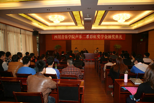 系主任江向东教授介绍彩虹奖学金设立的目的:主要用于奖励声乐二系专业成绩突出的尖子学生,奖励在重大声乐赛事中获奖的青年教师和学生,以及指导教师和伴奏教师。彩虹奖学金自设立以来,每年评出12—18名获奖者,截止2010年,共有80余名师生获奖。