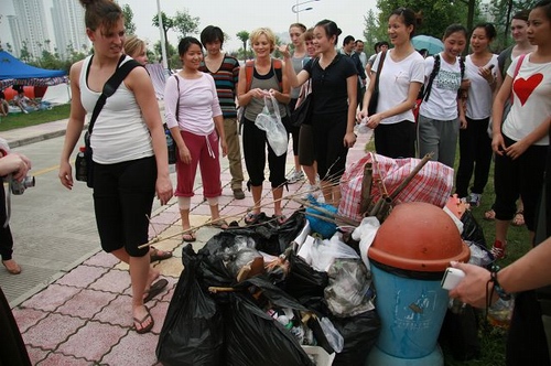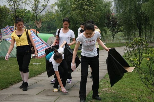 5月16日中午12点30分,川音新校区校园里,我系师生和来华进行海外学习计划的美国杨伯翰大学师生组织志愿者在校园开展“爱母校、讲文明”活动,在校园里打扫卫生,清洁校园里因地震波及影响、同学们在校园里搭帐篷等留下来的垃圾。 活动中,中美两国师生分成几组,就食堂外面草坪、校园湖周围、竹林及其草坪、教学楼周围、体育场周围、图书馆周围等公共场进行了清洁。在用双手捡拾垃圾的同时,老师们还规劝继续在校园里搭帐篷住宿的同学,告诉他们:要相信学校,大家要看看灾区的人民及救援部队官兵的坚强和自信,理性看待我们的学习生活环境,把精力投入到学习中,对灾区人民尽一份自己力所能及的力量,比如到学校组织的办公楼募捐点捐钱、捐物等,利用业余时间担当志愿者等等。我们要爱护母校、讲文明,为了大家的健康及维护我们美丽校园,回到宿舍住宿,回到教室上课,尽快恢复正常的学习和生活秩序。