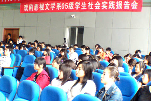 2007年4月12日,戏文系05级学生社会实践报告会在新都校区图书馆学术报告厅圆满举行。学院党委书记柴永柏,副书记彭建辉,副书记文云英,新管办主任刘立新,学生处刁处长等领导应邀参加了报告会。此外还有部分兄弟院系的系领导老师,以及学生会的干部应邀参加了报告会。