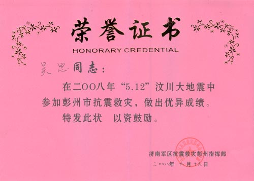 04级学生党员吴思同学在电视台实习期间遇到历史上罕见的汶川大地震,她跟随电视台的记者第一时间赶到灾区进行采访。 她勇敢坚强,临危不惧,一个多月中不顾连日劳累奔波和随时面临余震带来的各种危险,先后到达重灾区彭州、崇州、都江堰、北川等重灾区,发回了多起具有相当新闻价值的灾区灾情报道。被济南军区授予“抗震救灾优秀记者”光荣称号。
