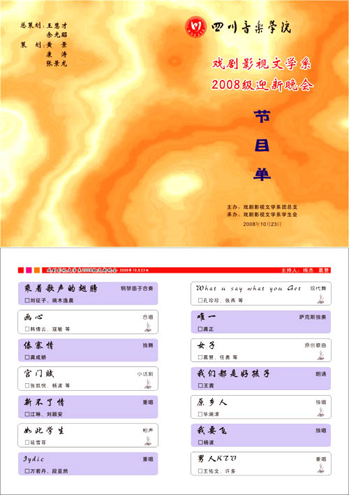 2008年10月23日晚六点,戏剧影视文学系于演艺厅举办了迎新晚会。系主任王慧才、系党支书于光昭,院教务处陈处长等院系领导参加了这次晚会。 此次晚会节目异彩纷呈,充分展现了同学们的才艺。开场表演《我要飞》以动感的节奏、精彩的演唱将现场气氛带动起来;钢琴与长笛的合奏《乘着歌声的翅膀》使观众沉浸在美妙的音乐中;大一新生排演的小型话剧《宫门赋》展现了同学们精湛的编、导、演才华;葛赞同学的原创歌曲《女子》让大家领略到戏文新生的音乐造诣;压轴节目男生二重唱《男人KTV》更是以完美的表现引得现场掌声不断,尖叫连连。此外,优美的舞蹈、感人的朗诵、滑稽的相声等精彩节目也给观众留下了深刻印象。互动环节更是拉近了舞台与观众的距离。晚会临近尾声,全体演员合唱《同一首歌》。最后王慧才主任讲话,肯定了这次晚会的质量,也对同学们提出了要求,寄予了厚望。 晚会的顺利开展不仅倾注了演员的努力,更离不开领导、老师及同学们的支持,尤其是学生会同学的种种付出以及各部门之间的密切配合,才换来晚会的圆满成功。这次晚会拉近了大一新生与学长学姐之间的距离,使我们彼此之间更加熟悉,关系更加融洽,尽快融入到戏文系这个大家庭中。