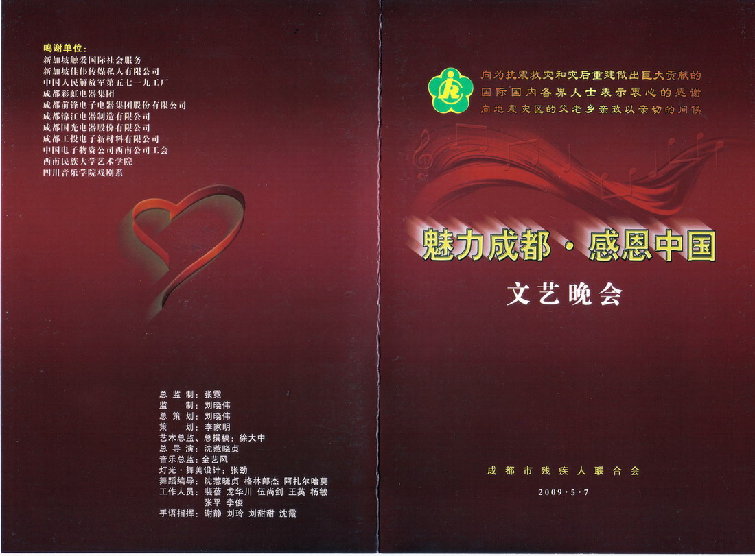 5月7日晚,“魅力成都•感恩中国”文艺晚会在崇州市艺术大剧院成功举行。该晚会是经成都市委、市政府批准的一台纪念5•12的文艺晚会,由成都市残联承办,市残疾人艺术团演出。我系积极配合本台晚会的演出,徐大中老师担任这台晚会的艺术总监,负责晚会的总体设计、安排,为晚会创作了一个情景剧《骆驼之歌》,并担任晚会总撰稿。 5•12一周年之际,“魅力成都•感恩成都”文艺晚会的成功举办,我系以实际行动向地震灾区的父老乡亲致以亲切问候,向为抗震救灾和灾后重建做出巨大贡献的国际国内各界人士表示衷心感谢。