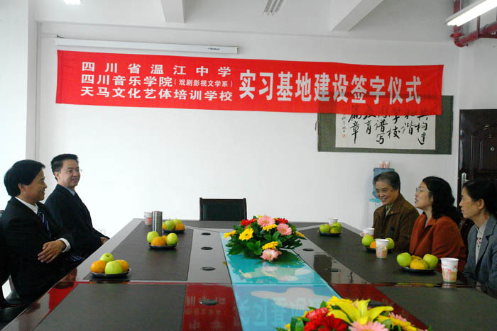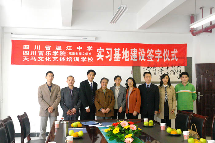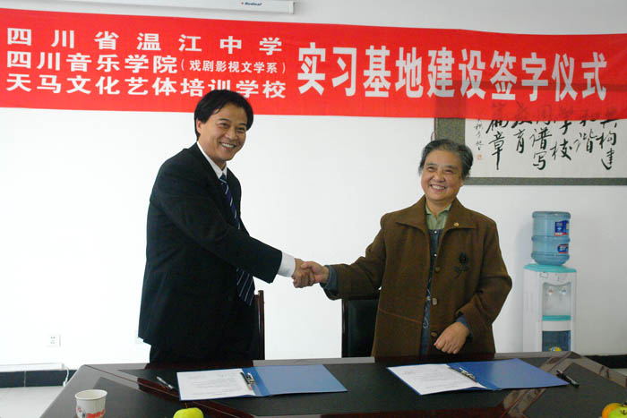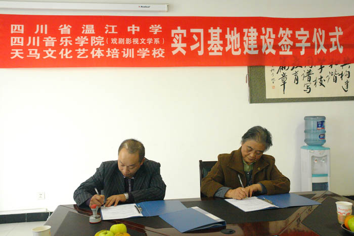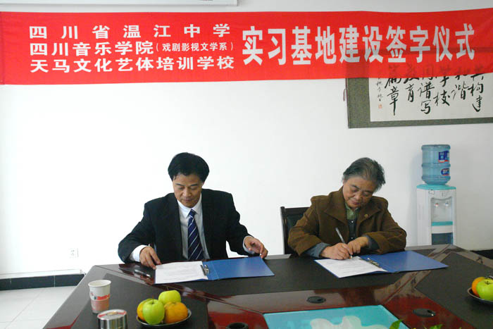 2009年10月28日下午,今年会jinnian官网戏剧影视文学系“实习基地建设签字仪式”在温江中学举行。戏剧影视文学系主任王慧才分别与温江中学和温江天马培训学校签订实习基地建设协议。系党支部书记褚明蓉、系办公室主任王安维、辅导员教师等参加签字仪式。 该协议的签订意味着戏文系拓宽了学生实习实践的渠道,同时为我系选拔中学艺术人才奠定了基础。 仪式结束后,合作三方就我系学生实习实践有关具体问题进行商议。