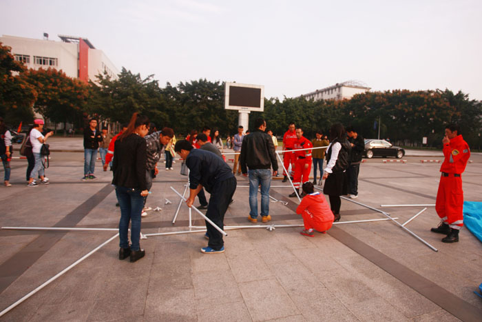 最后,在消防队员和我系教师的带领下,消防队员与同学们来到喷泉广场进行帐篷的搭建活动。在消防队员的示范下,同学们积极参与到搭建活动中。