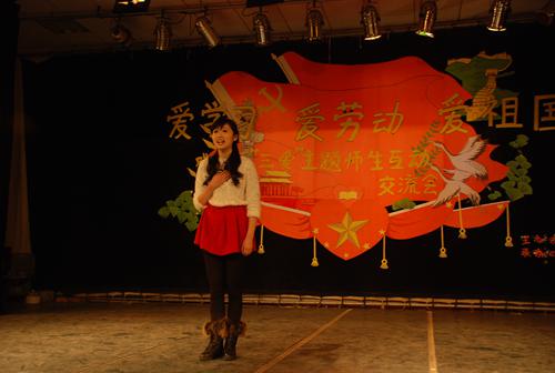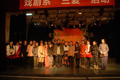 2013年12月10日,戏剧系“三爱”主题师生互动交流会在四教404小剧场举行。晚会由戏剧系党总支主办,戏剧系团总支协办,旨在弘扬“爱学习、爱劳动、爱祖国”的“三爱”精神,表现我系师生积极向上、阳光青春团结和谐的精神风貌。我系王书记、敖主任等党员教师和专业老师及我系学子欢聚一堂,参加了本次活动。 晚会以“爱学习、爱劳动、爱祖国”为主题,内容形式多样,丰富多彩。有“青春歌舞表演”、“配乐散文朗诵”、“服装现场制作”、“舞美手工作品”、“幽默哑剧”这五个内容的交流。 音乐剧同学表演的青春歌舞和配乐散文朗诵,声情并茂,感人肺腑;服装与化妆设计专业同学和专业教师老师同时上台,展示了自己的专业特色,让戏剧师生拍手叫绝;舞台美术设计专业老师将同学们的优秀手工作品带上舞台,详细的介绍了舞台美术的精髓所在,让同学们对舞美有了更深的了解;最后,服装化妆专业的曹老师带领非表演专业的同学表演的自创、自编、自导、的幽默哑剧“抓舌头”,将整场晚会的气氛推向高潮。演出博得了一阵又一阵的热烈的掌声,台上台下欢乐一片。 戏剧系“三爱”主题师生互动交流会,充分体现了师生们对祖国、对校园、对专业的热爱,以及我系师生积极向上、阳光青春、团结和谐的精神风貌。