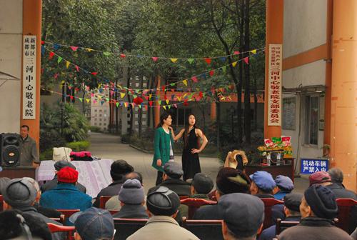 2014年3月15日,成都市新都区三河敬老院内一片欢声笑语。为了增强同学们的社会责任感,同时为了给老人送去温暖,我系团总支书记敬程老师带着全系志愿者们来到三河敬老院开展了慰问文艺活动。本次活动主要由为老人带去物质关怀、提供志愿服务和文艺活动组成。   15日上午志愿者到达敬老院时,将提前准备好的油、米等敬老物质及时交给了工作人员。随后,志愿者与老人拉家常,关心老人的饮食营养和医疗保健状况,并为老人打扫房屋等,用自己的双手为老人提供力所能及的服务。为了给老人们送去更多的温暖,志愿者在院区里还组织了文艺活动。活动中,志愿者与老人们进行了更深入而温馨的交流,志愿者的表演也获得了老人的高度赞扬,赢得了阵阵掌声。特别是一个军旅题材的小品,也许是让老人家们回忆起了年轻时的峥嵘岁月,感同身受,不禁潸然泪下。   三河敬老院是由成都市新都区社居委创办的福利性养老机构。该敬老院让社区孤寡、残疾、五保户和困难家庭的老人在社区实现“老有所养、老有所乐、老有所为、老有所教、老有所学”。这次活动让志愿者们了解了老人内心的声音,增强了自身的责任感和感恩意识。在活动即将结束时,老人们依依不舍的与他们合影留念,并表示感谢,希望我系师生再来。