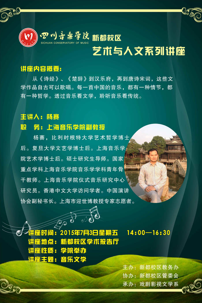 2015年7月3日,应戏文系副系主任左芝兰邀请,上海音乐学院杨赛教授来我院新校区开展了一场以“中国梦”歌曲创作为主题的讲座。此次讲座由戏文系副系主任左芝兰主持,参加讲座的还有戏文系相关专业老师、戏文系的全体学生以及新校区相关院系的歌词创作爱好者。