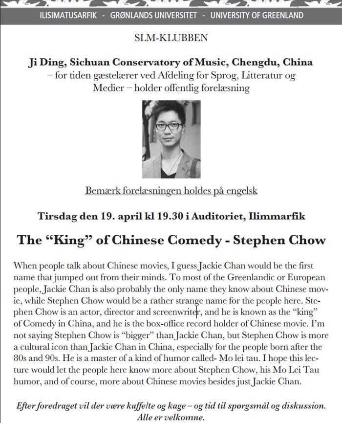 我系青年教师丁济受丹麦格陵兰大学邀请,作为其客座讲师于16年3月31日-5月3日在该校承担“好莱坞动画电影编剧与剧本分析”课程。并同时受格陵兰大学邀请于4月19日为全校以及全市公众做一次关于华语电影“喜剧之王”周星驰的公开讲座。此讲座信息已在格陵兰大学官网与当地报纸刊登,届时当地媒体也会对其进行报道并于电视或电台直播。