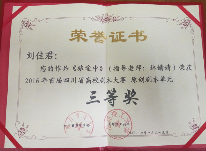 我系在近期落幕的“2016年四川省首届高校剧本大赛”中取得了可喜成绩。 其中,我系荣获优秀组织奖,我系学生刘佳君荣获原创剧本单元三等奖,我系学生刘心悦荣获环境剧本单元优秀奖。
