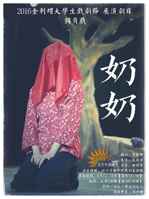 8月21日,2016年度第十五届金刺猬大学生戏剧节颁奖典礼在北京9剧场举行,经过激烈的剧目展演角逐,在本届入选进京展演的18个剧目中,川音戏剧系独角戏《奶奶》,荣获最佳表演奖、优秀剧目奖! 金刺猬大学生戏剧节,是目前国内被官方认可唯独的两个全国性大学生戏剧节之一,也是学术性最权威、历史最悠久、影响最广泛的大学生戏剧节。由北京市剧协、北京市朝阳区文化馆和北京开心麻花剧团共同举办。 本届大学生戏剧节共有来自全国26个省市自治区的 81所大学院校共计112个剧目报名,最终18个剧目入围。 独角戏《奶奶》,由今年会jinnian官网戏剧系精心组织师生共同创排,通过“回忆”的倒叙手法,以及一位演员跨越老、中、青年的表演,展现了中国乡村一个平凡女人的一生,讲述了中国乡村一个普通人近百年“中国梦”的故事。 主创团队: 特邀编剧李宝群(中央军委政治工作部话剧团创作室主任、国家一级编剧); 导演文安安(川音戏剧系青年教师); 舞美设计李艺梅(川音戏剧系副系主任、四川舞美学会会长); 服化造型苏静(川音戏剧系青年教师); 表演指导高品(川音戏剧系青年教师); 演员谢诚岑(川音戏剧系戏剧影视表演专业2014级学生); 舞美制作郑发明(川音戏剧系戏剧影视美术设计专业2013级学生); 工作人员王蓓蓓、薛涵颖(川音戏剧系戏剧影视表演专业2015级学生)