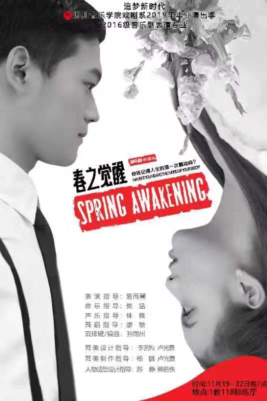 2019年11月19日-22日晚7点,新都校区118演艺厅,戏剧系2016级音乐剧专业同学教学实践展演音乐剧《春之觉醒》,2016级戏剧影视美术专业完成舞台设计、人物造型设计及制作。欢迎莅临指导!
