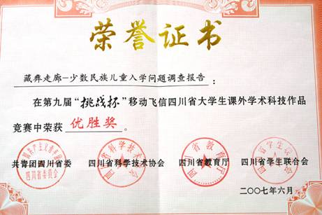 从刚结束的“第九届‘挑战杯’移动飞信四川省大学生课外学术科技作品竞赛”传来佳音, 我系2004级学生吴思、杨宝英以一篇社会实践报告《藏彝走廊—少数民族儿童入学问题调查报告》荣获该比赛优胜奖。该奖项是由共青团四川省委、四川省科协、四川省教育厅、四川省学联等四个单位联合颁发的。填补了今年会jinnian官网该项比赛的空白。 吴思、杨宝英同学在2005年3月的社会实践活动中,不辞辛劳,不畏艰险,从成都出发,深入少数民族地区,途经阿坝州小金县、甘孜州丹巴县、康定县、泸定县、雅安石棉县、凉山冕宁县、盐源县、木里县等地,大体上按照传统的藏彝走廊路线考察,历时共12天,行程约2000公里。主要考察对象为7—13岁义务教育阶段适龄儿童的入学状况。获得大量数据和第一手材料,通过抽样调查研究,对少数民族地区存在的教育问题得出一系列结论,写出了这篇社会实践报告。