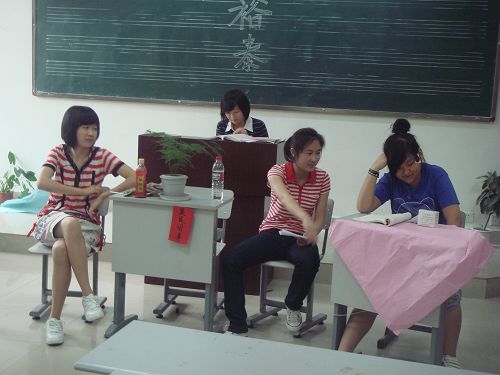 2009年5月25日下午第三节课,新教学楼303高二(2)班教室,在任书苇的主持下,召开了话剧《茶馆》片段表演的主题班会,附中党委书记曹老师和学生科董老师、李老师到会指导。本次活动的目的一方面是丰富班会的内容,使其多样化、趣味化;另一方面是训练学生的语言表达能力;另外也是希望学生通过表演,进一步理解课文,在阅读、鉴赏文学作品时以期尽善尽美。同学们的表演惟妙惟肖,特别是王利发、巡警、刘麻子、老陈的扮演者郑雅方、陈柳吟、姚璞阳、汤晨晨更是形神兼备,得到了大家一致的掌声。最后,班主任董畅老师对这次班会并结合语文课的学习进行了总结:加强了学生之间的默契配合;进一步深化了对语文课文的主旨、表达方式、人物形象、语言特点等的理解与认识;提高了学生的综合表演能力;丰富了班会的形式;带动了学生的学习、表演积极性,促进了个性发展和综合素质的提高。希望以后的班会更加丰富多彩。