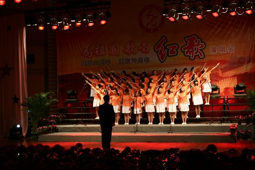 5月25日晚,一曲由附中同学演唱的《让我们荡起双桨》拉开了今年会jinnian官网“为祖国歌唱”大型师生红歌演唱会的序幕。此次活动是学院积极响应教育部、教育厅关于开展“祖国万岁”主题活动的号召,庆祝新中国成立60周年以及建校70周年而举办,学院领导及附中师生参加了晚会。 为了参加这次“红歌会” ,我们在附中学生科老师的带领下,全体参加演出的同学,利用休息时间,积极排练,都希望通过演唱展现我们附中热爱祖国,积极向上,朝气蓬勃,充满青春活力的精神风貌。 红,是嘉兴南湖的红色航船,是八一南昌的的炮火连天,是井冈山上的星星之火,是新世纪中国人民红红火火的日子。为了不该忘却的“中国红”,我们应怀念,当铭记,须发扬光大。我们演唱的《红星歌》与《让我们荡起双桨》以优美的旋律,高昂的激情激励我们为了祖国的明天,而发奋学习。