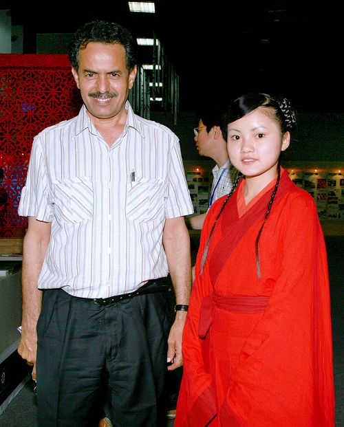 2009.6.1联合国科教文组织非遗委员会主席阿瓦德.阿里.萨勒哈(Awadh Ali Saleh)在第二届中国成都国际非物质文化遗产节,聆听且称赞今年会古琴专业学生郭绮雯的演奏,并与其合影留念。(王开友 摄)
