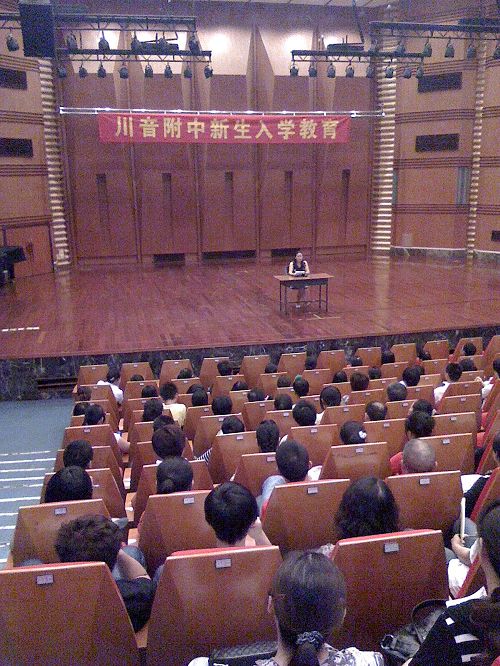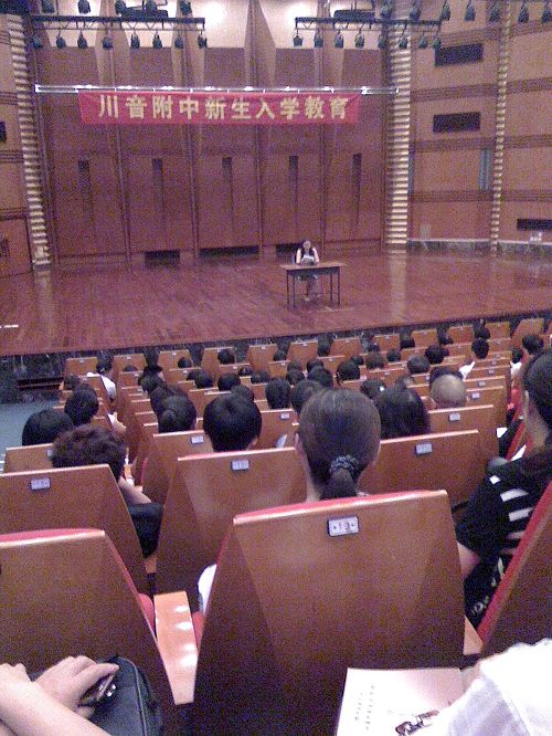 2010年8月27日下午3点,川音附中在学院大音乐厅召开了2010级新生入学教育。 时至初秋,微风中带着阵阵凉意,来自全国各地的新生汇集到川音附中,同学们个个神采飞扬,激动兴奋,在这个陌生的环境里,同学们将带着自己的梦想扬帆奋进。 首先,由唐燕翎副校长向家长及同学们介绍附中的发展和各方面取得的傲人成绩。接着由学生科科长董老师讲解了学生应当遵守的行为规范以及新生入学后应该如何调整心态,保持最佳学习状态的方法,要求同学们做到品学兼优,德智体全面发展。最后,由学生科李老师具体讲解了住校生的管理规定和请假制度,让大家共同营造一个良好的住宿氛围。