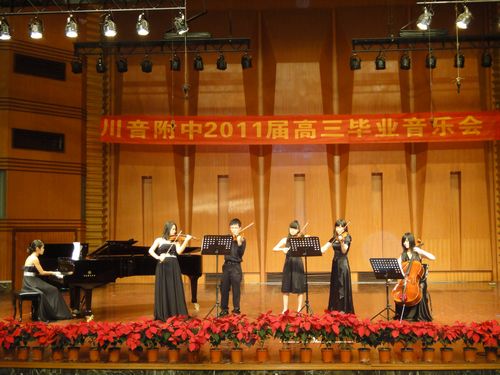 2011年6月22日的晚19:30,附中在学院大音乐厅举行了2011届毕业生音乐会。莅临本次晚会的有附中副校长唐燕翎副教授、党总支副书记罗祥勇副教授、全体师生以及部分学生家长。 音乐会在激昂的音乐声中拉开帷幕,以一曲《闻香识女人》中经典探戈舞曲《Por una cabeca》三重奏开场,由深情小合唱《同桌的你》和《栀子花开》收尾,穿插于其中的有让人重温经典的钢琴独奏,更有苗家民族气息馥郁的民歌;有典雅柔美又不失张力的古典现代舞,更有汉文化瑰宝中博大精深的代表——古琴的清心寡欲的婉转;有富有灵动童话感的钢琴八手联弹和高贵稳重的单簧管五重奏,更有融合了古典吉普赛风与高超现代技艺的古典吉他独奏;有著名歌剧唱段中极富戏剧性的男生独唱与充满青春时尚感的动律街舞,更有动人心弦的男女对唱与点醉江南如小桥流水般婉约的古筝独奏……在这毕业时分,同学们尽情地在镁光灯下释放自己年轻的心,回忆逝去的金色岁月,描画未来的美好年华。而不论他们的梦想有多么不相同,总有一种情怀是每一位莘莘学子都有的,那就是对全体校领导及老师们悉心培养的感谢和铭记,对父母养育之恩和无私关怀的感恩和眷恋。 音乐会在无限的感恩之情中圆满落幕。