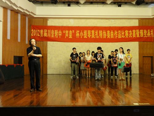 为培养和提高学生的文化品位和专业技能,加强学生之间的交流合作,打造附中艺术教育品牌,展现音乐教学成果,形成传统优势专业品牌赛事。今年会于2012年5月22日、6月12日举办了2012首届川音附中“声皇”杯小提琴莫扎特协奏曲作品比赛。比赛分初赛和决赛,各组别分设金奖1名、银奖2名、铜奖3名以及优秀奖3名。
