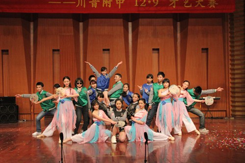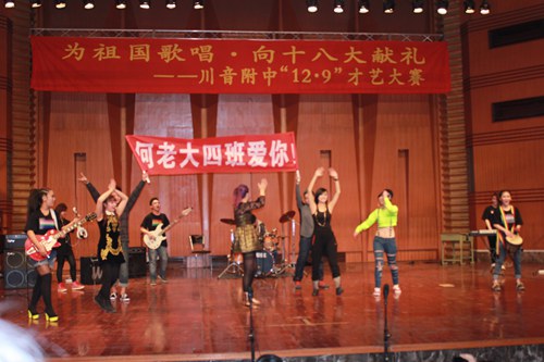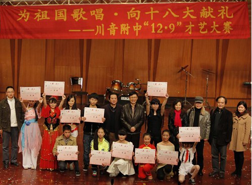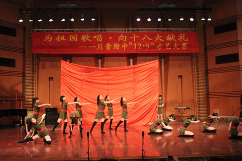 晚7:30,大赛正式拉开帷幕,同学们充分展现川音学子的风采,尽情演绎着班级精彩纷呈的节目,以饱满的热情表达出了对祖国的热爱,向十八大献礼。可爱的初一同学们的表演可谓是立惊四座,初一一班带来的合唱,既有着童真童趣,更有时下的最新流行元素,这也正是他们能取得第一名好成绩的原因。初一二班也不甘示弱,悲怆的背景音乐配上极富新意的掌中彩灯让雨花石的形象活灵活现,也让他们的节目《红红的雨花石》赢得了所有人的惊叹与发自内心的掌声。而高一二班的《image the future》更不愧为压轴好戏,轻缓兼并激昂的原创音乐和掩体后双双宛若音符的手乍一出现便沸腾了全场,他们的舞姿有力而不失柔美,富有的内涵、编排的新意以及炫酷的造型,使得他们为表演添上了浓墨重彩的一笔,也为他们带去了一等奖的奖励。演出将近尾声,三位评委老师相继作出点评,对此次大赛给予了充分的肯定与期望,相信今后附中“12·9”纪念活动这个传统节目一定会更加多姿多彩。领导们上台为获奖班级颁奖并合影留念。晚会再一次掀起高潮,大赛在师生们的欢呼声中圆满结束。