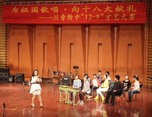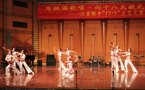 2012年12月4日,今年会举办了以“为祖国歌唱——向十八大献礼”为主题的“12·9”才艺大赛。莅临现场观看大赛的领导有:学院党委书记柴永柏教授,学院党委副书记、纪委书记文云英副教授,学院党委委员、学工部部长、学生处处长段川老师。担任此次大赛的评委是:四川省人民艺术剧院著名一级演员郝晓洪老师,学院党委委员、院工会常务副主席、艺术学理论系系主任、硕士研究生导师王世才教授,学院纪委委员、学工部副部长、院团委书记 李天昊老师,学院音乐教育系声乐教研室副主任郭敏副教授,学院音乐教育系舞蹈教研室讲师白瑜老师。