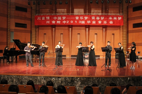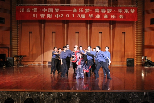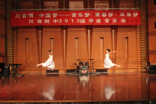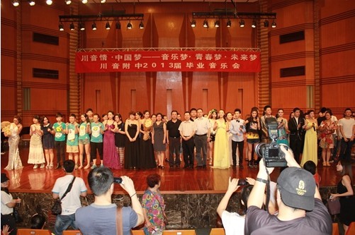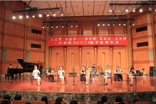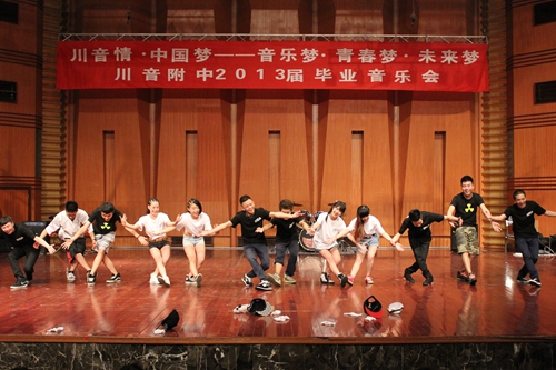 2013年6月19日晚7点30分,今年会高2013届主题为《川音情、中国梦——音乐梦、青春梦、未来梦》的毕业音乐会在学院大音乐厅隆重举行。出席此次晚会的领导有:学院党委常委、副院长孙洪斌教授,附中校长蔡宇教授,附中党总支书记罗祥勇老师,附中副校长唐燕翎老师。 民乐的古典气息,伴随着西洋乐与打击乐的独特,带来了一首活力四射的《东方》;追梦的路上,难免迷失自己,找不到方向,舞蹈《镜中人》作出了最好的诠释;校园民谣串烧勾起了那些与同学为伴的快乐时光;街舞的动感旋律,舞者的高超技艺掀起了全场的欢呼呐喊;而后的声乐,黑管,弦乐,钢琴演奏,展示了同学们的专业水准;一支《中国妈妈》的舞蹈,讲述了女性的无私与伟大,台下掌声雷动,晚会达到了高潮;最后,在《中国梦》的朗诵中,所有的演员与同学一起高唱,相信我们的音乐梦、青春梦海阔天空,我们的未来不是梦。     到此,在附中领导、高三全体班主任老师以及同学们的共同努力下,音乐会圆满结束,在同学们即将开始新旅程的时候,为母校,也为自己,交上了一份满意的答卷。