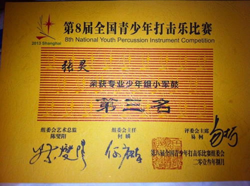 附中初二学生张灵参加全国青少年打击乐比赛获奖
