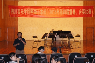 5月26日下午1:30,学院小音乐厅,在附中蔡校长激昂的助赛词中,激烈的决赛拉开帷幕。大赛评委阵容强大:川音管弦系主任李开祥教授、川音管弦系总支书记、研究生处处长谢宇教授、川音民乐系前系主任易加义教授、川音民乐系副系主任梁云江教授、川音管弦系副系主任刘盾教授、川音管弦系弦乐教研室主任罗瑜教授、川音管弦系程泽威教授、中国人民大学艺术学院副院长赵方教授、中国人民大学艺术学院音乐系主任王玫教授、中国人民大学艺术学院程亚威副教授。