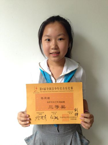 今年会初三学生杨斯贻喜获第九届全国青少年打击乐比赛三等奖