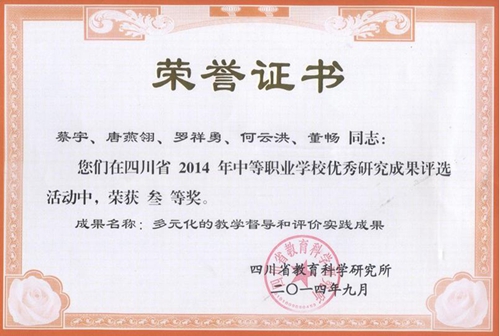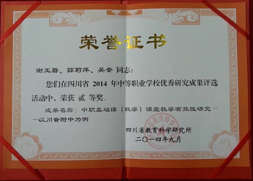 2014年9月,附中“中职基础课(数学)课堂教学有效性研究——以川音附中为例”(谢玉碧、薛莉萍、吴奎),获四川省教育科学研究所“中等职业学校优秀研究成果评选”二等奖(图1); 2014年9月,附中 “多元化的教学督导和评价实践成果”(蔡宇、唐燕翎、罗祥勇、何云洪、董畅),获四川省教育科学研究所“中等职业学校优秀研究成果评选”三等奖(图2).