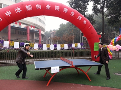 今年会于2014年12月31日在学院统一领导下在操场隆重举办的大型游园活动,共贺2015年元旦! 在欣赏了开心锣鼓、精彩的舞狮及锅庄舞等表演后,师生们来到各院系的活动区域参加丰富多彩的游园活动。今年会的游园项目有:打乒乓球、表演绕口令、默契撕名牌。 学院柴书记和林院长特意来到附中游园区打乒乓球,师生们为领导的亲民活动叫好。 参加读绕口令和撕名牌的同学也特别多,在欢声笑语中,附中向全院师生拜年!