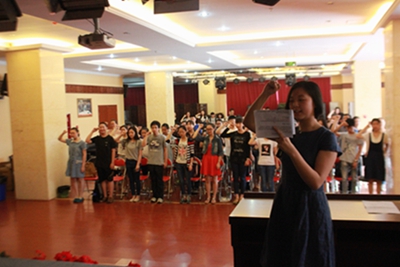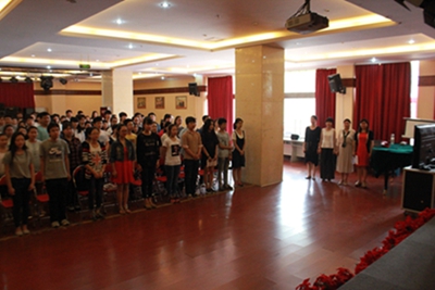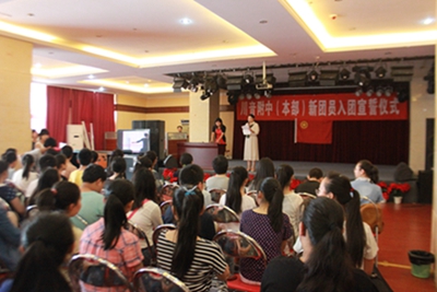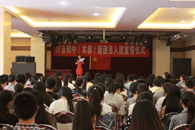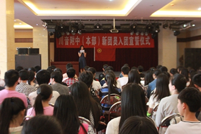 2015年5月6日下午今年会在学院学生活动中心举行新团员入团宣誓仪式。参会的有:附中党总支书记唐燕翎老师、学生科科长董畅老师、副科长李燕老师、团总支书记李佳老师、陈叶丹老师和全校新团员、老团员。 首先,全体肃立、唱奏国歌,然后,董科长宣布本次新团员名单,唐书记为新团员颁发团员证,接着,由高二一班团支书亢溱同学带领全体新团员,以宏亮的声音,面对鲜艳的团旗,庄严宣誓“我志愿加入中国共产主义青年团,坚决拥护中国共产党的领导,遵守团的章程,执行团的决议,履行团员义务,严守团的纪律,勤奋学习,积极工作,吃苦在前,享受在后,为共产主义事业而奋斗!”接下来,新团员代表初二二班李春媛同学上台发言,她郑重承诺将以饱满的热情,积极进取的态度投入到今后的学习生活中。最后,唐书记作了重要讲话:号召团员们努力学习,提高自身素质;牢记今天的青春誓言,用实际行动践行青春誓言,传递青春正能量,书写美好中国梦,为团旗增辉增色,为早日成为国家栋梁之材而不断奋斗。 入团宣誓仪式在高亢的团歌声中结束,此次活动为所有团员上了一堂生动的思想教育课,增强了团员的社会责任感和使命感,他们在感受着无尚光荣的同时,也肩负了一份沉甸甸的使命。