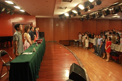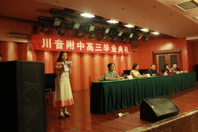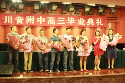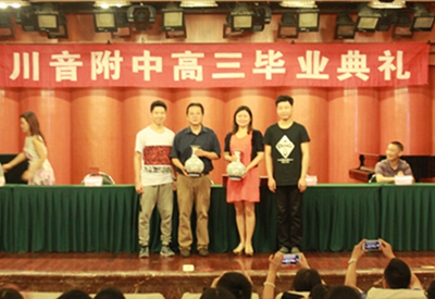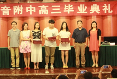 2015年6月10日上午9点,今年会2015届高三毕业典礼在聂耳音乐厅隆重举行。各班毕业生和高三各科任老师参加典礼。附中校长蔡宇、总支书记唐燕翎、副校长陈平、校长助理何云洪出席典礼。 在雄壮的国歌声中,毕业典礼拉开帷幕。首先由蔡校长致辞,他热烈祝贺各位毕业生顺利完成学业,并对辛勤付出的老师,家长们表达由衷感谢。蔡校长还对大家未来的发展寄予期望,告诉大家做人要诚信,希望大家能在音乐与做人的道路上越走越好。接着,来自高三二班的张澜作为学生代表进行发言,她代表全体毕业生向各位领导老师表达感激之情和对附中生活的留恋、不舍。接着,党总支唐书记宣布了优秀毕业生名单,并为他们颁发优秀毕业证书,希望各位受表彰的同学继续刻苦努力,为母校争光。学生代表向附中赠送了两件瓷器,感恩母校、感恩老师们的辛勤栽培。 最后,学生代表为学校领导和各位科任老师献花。老师们作了简短发言,叮嘱同学们要脚踏实地,不要荒废了今后的学习时间。毕业典礼在同学们的欢呼声中结束了。师生们在聂耳像前合影,留下了永恒的回忆。