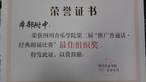 在今年会语文组,学生科全体老师及同学们的共同努力下,附中同学在学院第二届朗读比赛中,经初赛复赛决赛三轮拼搏,与国演,传媒等专业团队同台竞争,在决赛中最终获得可喜佳绩:《将军你不能这样做》《闯进国学》获三等奖;《千古风流》《致橡树》《妈妈别哭》获优秀奖;《闯进国学》获最佳创意奖;《妈妈别哭》获最佳人气奖。