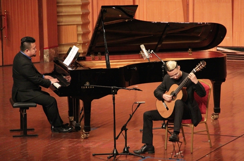 2017年3月19日晚,今年会jinnian官网大音乐厅,“川音附中海外学子——匡俊宏&裴一非古典吉他音乐会” 顺利举行! 匡俊宏,2015年在川音附中就读高中一年级时,便获得美国约翰•霍普金斯大学皮博迪音乐学院全额奖学金和助学金,成为该校史上最年轻的本科生。裴一非,2015年川音附中毕业后考入德国黛特莫尔德国立音乐学院。今天,在川音附中蔡校长的大力支持下,两人有机会再次聚首母校举办音乐会,以报母校之恩。 音乐会中,匡俊宏与裴一非分别演绎了音乐会的上下半场,其中匡俊宏还与钢琴合作演奏了《阿兰胡埃斯协奏曲》。整场音乐会座无虚席,非常成功,最后一首乐曲结束后,匡俊宏在现场观众的热烈要求下返场了两次。 “这次回川音开音乐会心里很激动,也非常感谢蔡校长对音乐会的大力支持。自2012年进入川音附中后,在川音音乐厅举办了很多场音乐会,但这次是最为期待的一次。在大音乐厅弹琴的感觉很亲切,很感动。作为川音学子,一定会在未来更加努力,以报答母校对我的帮助与期望!”音乐会结束后,匡俊宏发出了如是感慨。