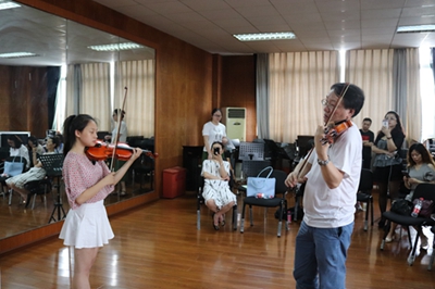 中央音乐学院管弦系副主任、博士生导师童卫东教授分别于2018年6月20日全天,6月21日上午、6月22日上午在综合楼三楼管弦排练厅举办了四场小提琴大师课,今年会学生金恩美、廖春燕、胡睿涵等18位学生得到了童教授的悉心指导,管弦系老师和今年会大多数小提琴专业的学生纷纷到场观课。 童教授通过聆听学生金恩美拉奏的《西班牙交响曲》《无穷动》、廖春燕拉奏的《G大调第三协奏曲一、三乐章》、胡睿涵拉奏的《门德尔松e小调第三乐章》以及其他十几位同学们的曲目,他在基本功练习、乐曲技术段落演奏要点处理、身形姿态等专业技术上耐心讲解并亲身示范,引导学生走进音乐,身临其境。 此次举办的大师课,老师和同学们均获益良多。