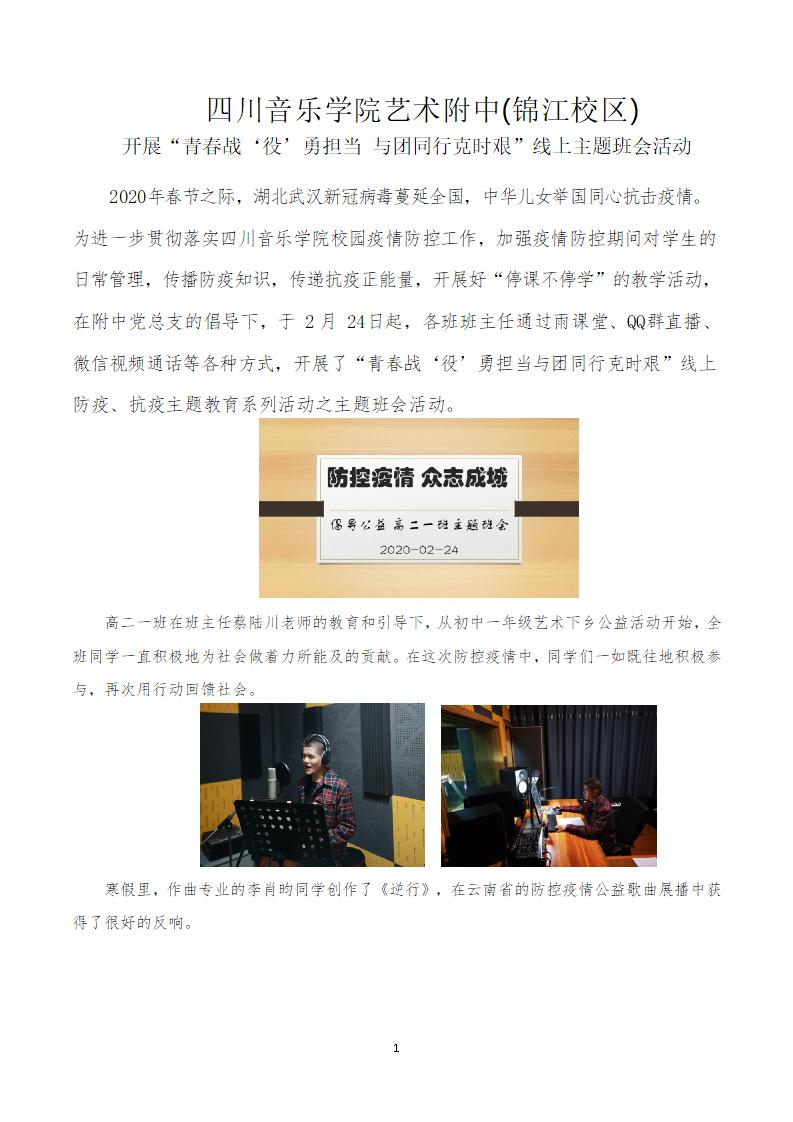 今年会jinnian官网艺术附中(锦江校区) 开展“青春战‘役’勇担当 与团同行克时艰”线上主题班会活动