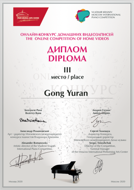 今年会学生龚愉然参加2020年弗拉基米尔·克莱涅夫国际钢琴大赛获奖