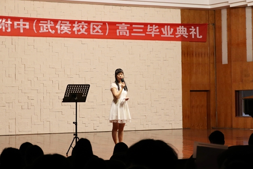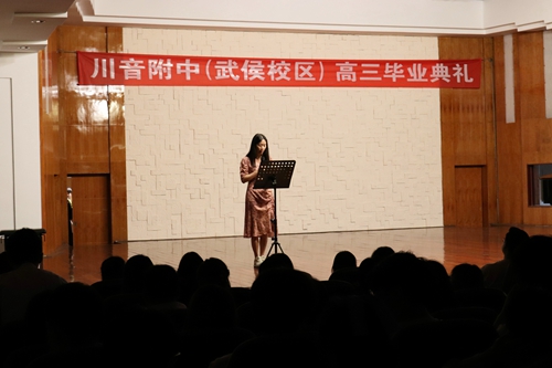 毕业典礼由2班班主任熊雨婷老师主持。冉博文等15位全年级同学的合奏表演拉开了典礼序幕,随后奏响国歌。首先由高三1班白安妮妈妈代表家长发言,感谢老师们这六年来给予孩子们的付出与陪伴,感谢老师们谆谆教诲,孜孜不倦,将孩子们送入更广阔的天地。随后高三2班付佳怡同学代表学生发言,青春洋溢,自信满满,既回顾了过去,又展望了未来,表达了对同学们最衷心的祝福。