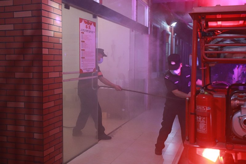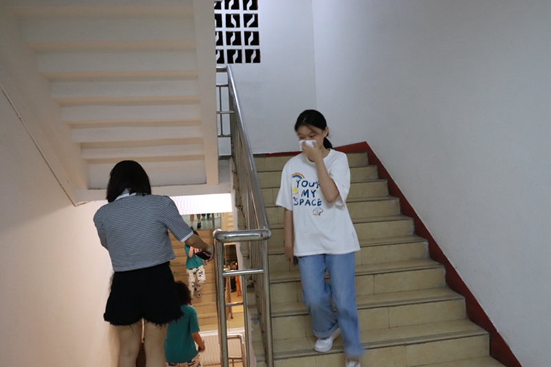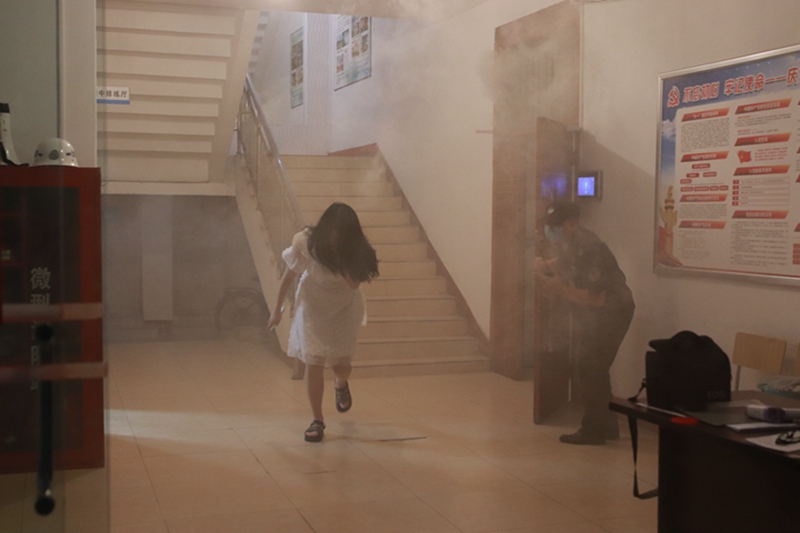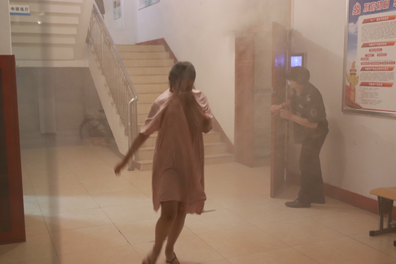 同学们按要求回到寝室,各楼层发出烟雾后在老师的紧急催促和指挥下迅速用毛巾捂住口鼻俯身有序撤离到楼下安全地带,学院消防车第一时间赶到宿舍楼做出火情初步处理,紧接着龙江路消防中队两辆消防车紧急赶到现场,消防员火速跳车冲进宿舍楼,整个演练一气呵成,师生们爆发出热烈的掌声。