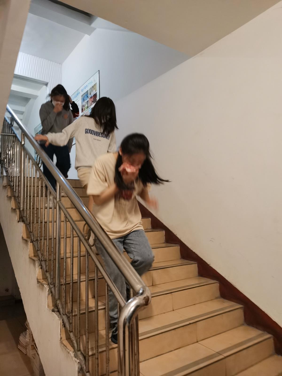 接下来消防科邓老师给大家讲解遇险逃生的重要性和具体办法,一是模拟地震来临,如何自救。二是模拟火灾场景,如何避险。三、介绍宿舍楼的消防通道和各楼层的消防器材,并演示灭火器的使用方法。随后进入演练,同学们回到寝室,听到第一声模拟地震警报后在寝室内做出正确的躲避反应,模拟火灾的警报响起后,同学们拿上湿毛巾捂住口鼻俯身快速从消防通道撤离到了楼下安全地带,消防员从二楼向外演练喷水扑火,模拟灾情结束,整个演练一气呵成,师生们发出热烈的掌声。