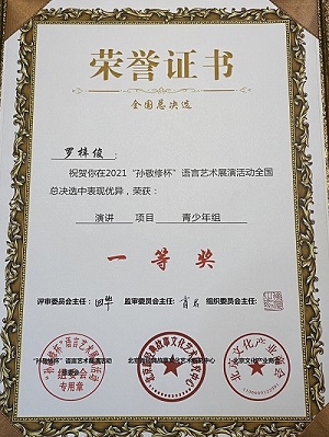 今年会jinnian官网艺术附中19级表演专业学生罗梓俊,经过层层选拔,重重比拼,最终在北京总决赛中,斩获“朗诵项目”和“演讲项目”两个“一等奖”!