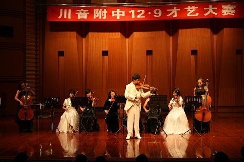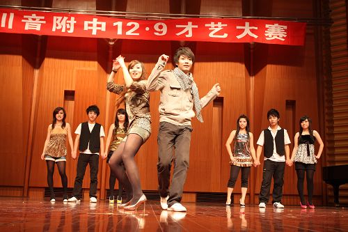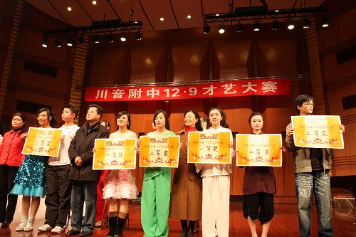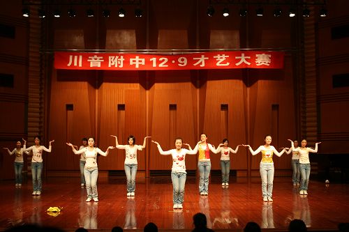 11月21日,川音本部附中2008年“12•9”学生才艺大赛顺利拉开帷幕。各班的同学和班主任,都精心编排了一个又一个精彩而富有创意的参赛节目,在展示青春风采的同时也宏扬了爱国主义精神,有以“5•12”地震为主题,有以校园生活为主题等13个精彩节目。分获奖项,比赛圆满结束。 一等奖:初三一、班 《震•痛•我的心》 高二、三班 《爱在天地间》 二等奖:初三、一班 《青青校园》 初二、一班 《小 草》 高一、一班 《舞动宇宙》 高二、一班 《革命之火》 高二、二班 《东方红》 三等奖:初一、一班 《四 季》 初一、二班 《威尼斯法庭》 初二、二班 《歌舞青春》 高一、二班 《舞动青春》 高一、三班 《This is party time》
