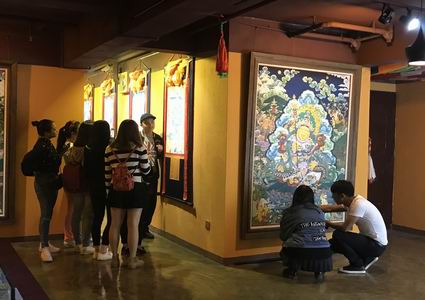 2017年04月18日下午,在格桑梅朵老师和周舟老师的带领下,我系2014级32位同学一同前往武侯区高华横街参观了攀德唐卡学校成都展厅。 此次活动中,唐卡学校的恩珠老师先集中为同学们讲解了唐卡的制作,以及每幅唐卡背后所蕴含的深意。恩珠老师就制作唐卡时,在题材和用料上的选择、制作方法,以及当前唐卡的主要流派等方面对我们进行了介绍。随后,恩珠老师带领我们参观了唐卡制作室,近距离的观看了唐卡的制作工具和矿物原料。 唐卡是藏族文化中一种独具特色的绘画艺术形式,具有鲜明的民族特点、浓郁的宗教色彩和独特的艺术风格;题材内容涉及藏族的历史、政治、文化和社会生活等诸多领域。它被誉为中国民族绘画艺术的珍品,被称为藏族的”百科全书”,也是中华民族民间艺术中弥足珍贵的非物质文化遗产。 通过这次参观唐卡学校,让同学们更直观、更系统的了解了唐卡的制作过程,并且更加深刻地感受了唐卡艺术的魅力。
