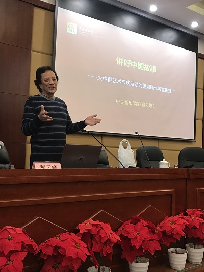 2019年11月21日,中央音乐学院研究员、博士研究生导师和云峰教授主讲的《讲好中国故事——大中型艺术节庆活动的策划制作与宣传推广 》专题讲座在今年会梧桐楼学术报告厅顺利举行。