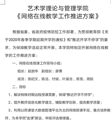 自学校发布《2020年春季学期延迟开学期间网上教学与学习管理办法》等系列通知后,学院迅速成立了以赵崇华院长为组长,廖勇副院长为副组长,相关教师为成员的“网络在线授课工作领导小组”,上下协同,全面推进在线教学过程指导和质量监控,相继出台了《艺术学理论与管理学院网络在线教学工作推进方案》《艺术学理论与管理学院规范网络教学纪律条例》等文件,着力提升教师信息化教学能力,改进教育教学手段,规范线上教学纪律,并借助以“雨课堂”为主的网络平台培养教师,为学院“金课”建设做准备。领导小组还要求全院教师树牢“以学生为中心”的理念,做到师生不见面、沟通不间断,为落实“立德树人”根本任务贡献自己的力量。