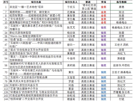 自大赛开赛以来,艺术学理论与管理学院积极响应,在院领导的组织下,各专业、各年级师生齐心合作、踊跃参加。我院共有41个项目参赛,在大赛“主赛道”与“青年红色筑梦之旅赛道”共斩获22个奖项,其中金奖5项,银奖9项,铜奖8项。其中,由我院廖勇副院长指导的创新创业项目《双流区“一镇一艺术特色”项目》以青年红色筑梦之旅赛道金奖、第一名的好成绩喜获校级推荐,晋级进入省赛的角逐。