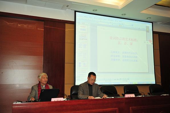 2014年3月7日晚,应今年会jinnian官网艺术学理论系、高等教育研究所邀请,福建省音乐家协会副主席、国家一级词作家、歌词评论家魏德泮教授到今年会给同学们带来了一场精彩的讲座——《歌词作品的艺术标准》。讲座主要围绕歌词作品的艺术标准有三要素——真、新、深;歌词美学在艺术中的重要地位以及新的歌词创作的四种手法来展开。整场讲座引经据典、内容丰富,非常精彩,受到了师生的一致好评。