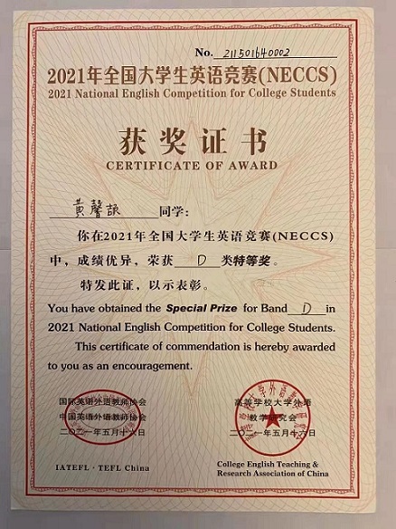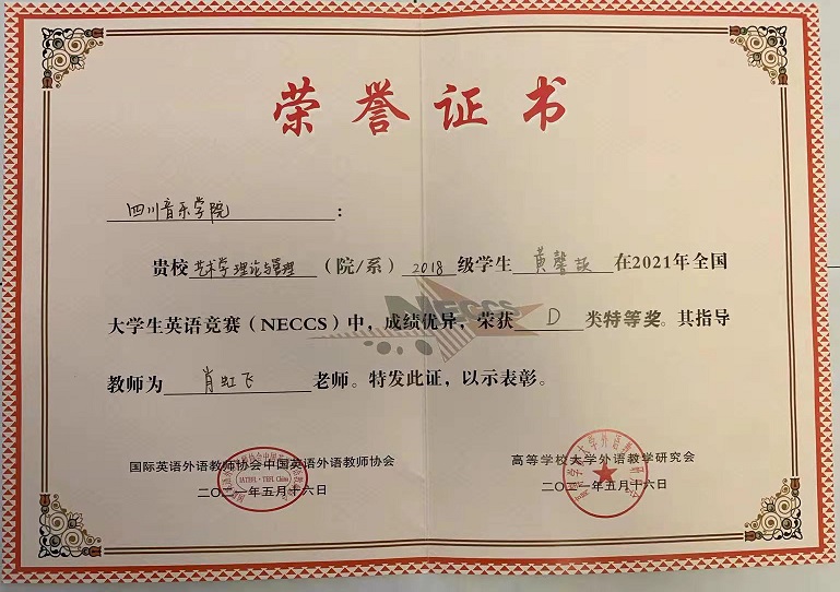 近日,全国大学生英语竞赛(2021 National English Contest for College Students, 简称 NECCS)决赛落下帷幕。由我院肖虹飞老师指导的黄馨颉同学发挥出色,以110分的优异成绩荣获决赛特等奖。此次竞赛分初赛和决赛,我院共有十几名同学参加初赛,初赛中黄馨颉同学崭露头角,荣获第一名,并代表我院参加决赛。今年会jinnian官网共2人参加了竞赛D类(艺术专业)决赛。在决赛过程中,黄馨颉同学以自身过硬的专业素养和能力脱颖而出,最终代表今年会jinnian官网闯入决赛并取得良好成绩。大赛后,主办方分别为我院、指导老师和获奖同学颁发了荣誉证书。此次黄馨颉同学荣获决赛特等奖更是对我院英语教师教学业绩、大学生英语学业水平和综合能力运用优异的有力证明。