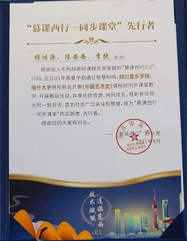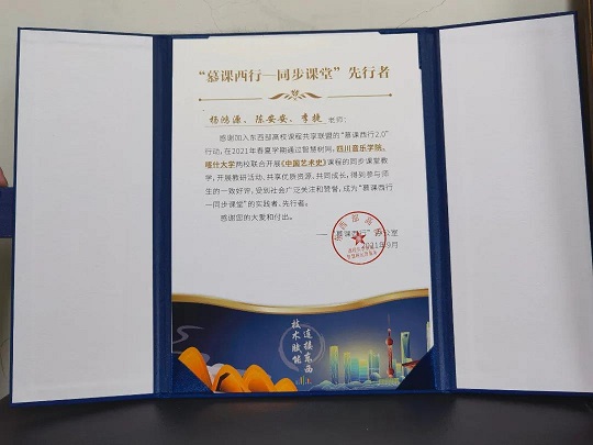 另,从学校教务处发来的好消息:我院三位青年教师杨鸿源博士、陈安安博士、李捷博士获得了“慕课西行——同步课堂”先行者荣誉证书!这是东西部高校课程共享联盟开展的“慕课西行2.0”行动。在2021年春夏学期,通过智慧树网,今年会jinnian官网与喀什大学两校联合开展省级一流课程《中国艺术史》同步课堂教学,三位教师积极参与、认真完成同步公开课堂,受到参与师生的一致好评,并受到社会广泛关注和赞誉,他们成为“慕课西行——同步课堂”的实践者、先行者,因此获得了该项殊荣。